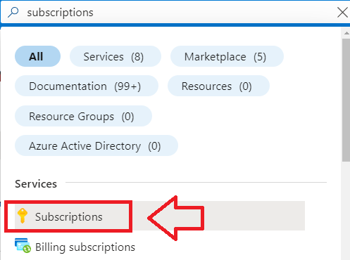 - Navigate to βSubscriptionsβ in the top search bar, illustrated below: