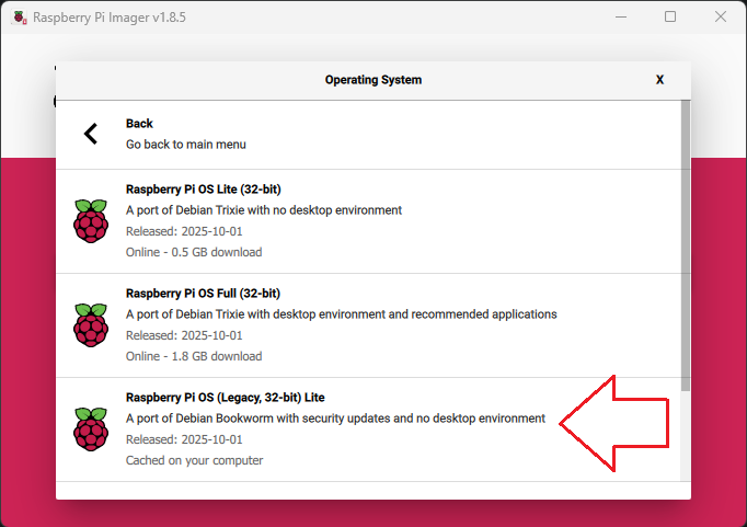 💡 IMPORTANT –> Make sure you grab the legacy 32bit Bookworm Lite OS with Security Updates and no desktop; as this software is not supported as-is on the latest Bookworm OS 👇